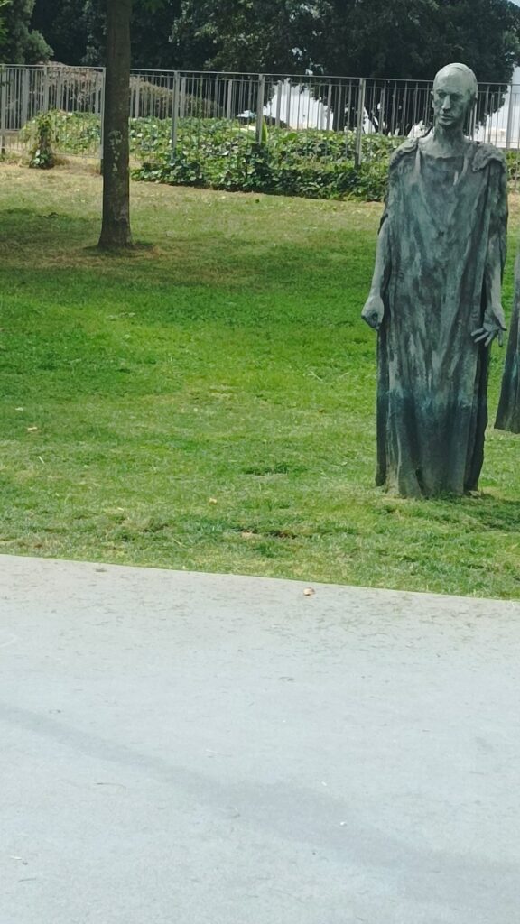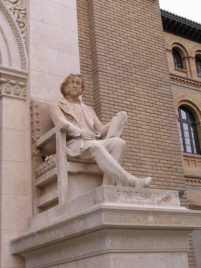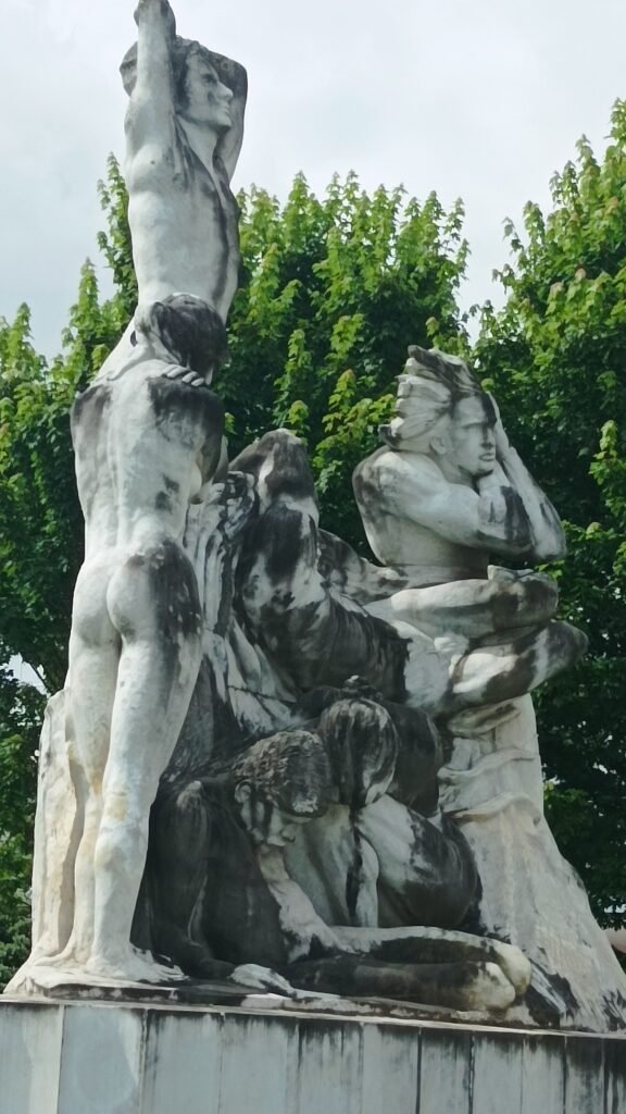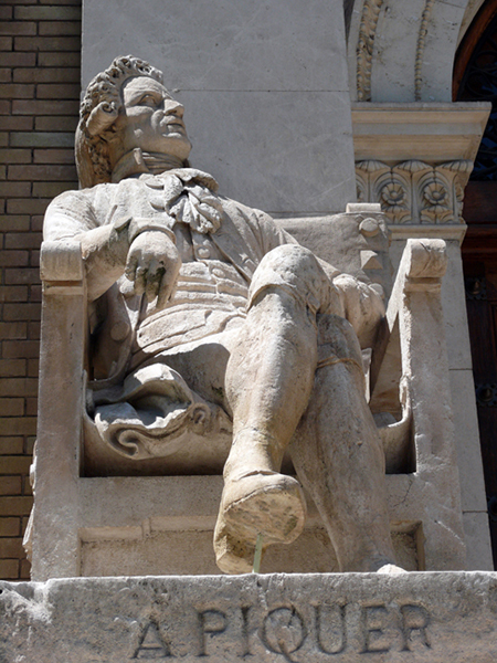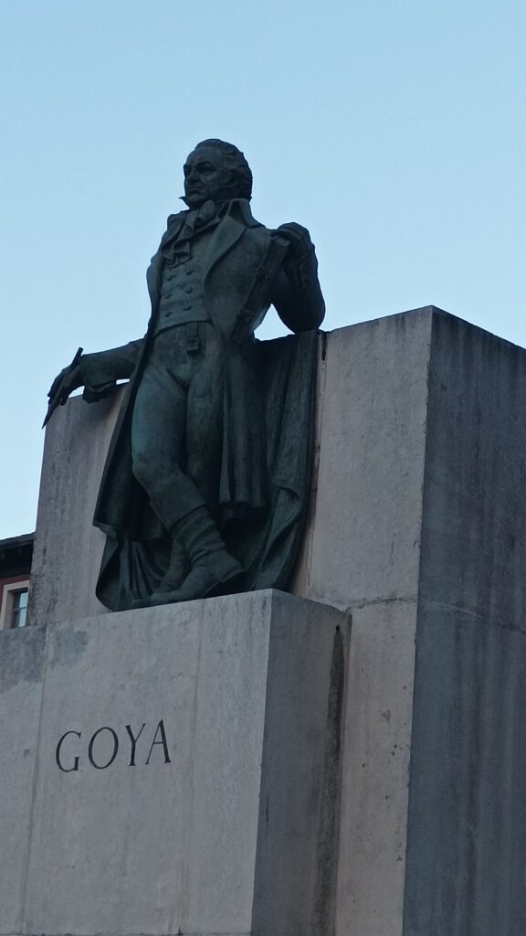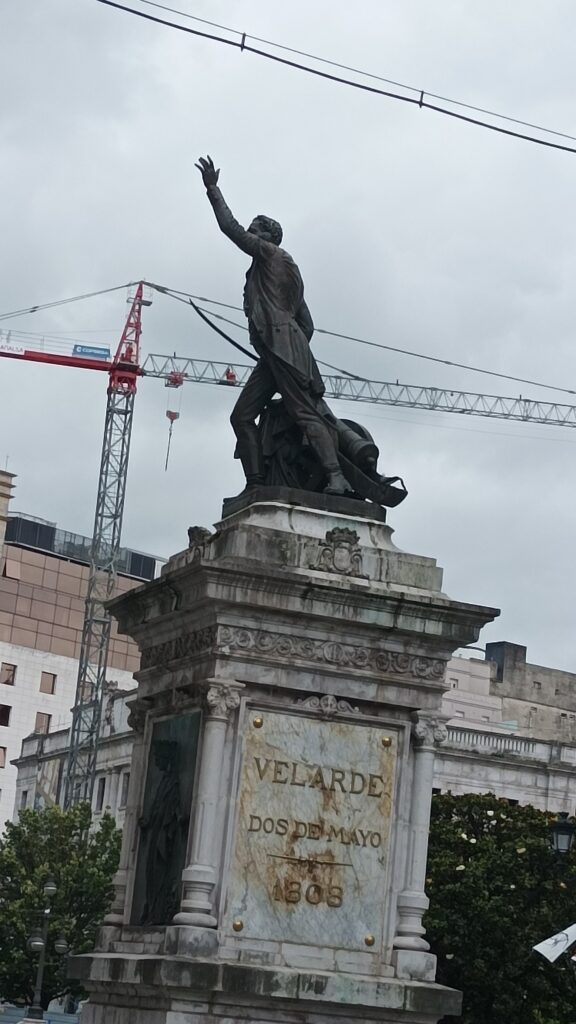 A la entrada de una gran plaza el monumento a Velarde. Este fue el militar que junto con Daoiz defendieron Madrid de la invasión francesa. La escultura parece estar escorada en la entrada de la plaza sin embargo tiene sentido esa indicación de la mano que apunta a Francia.