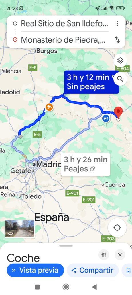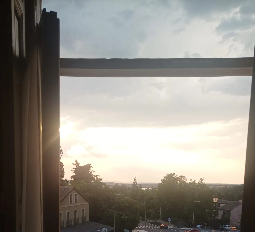 El primer tramo era de Badajoz a los Reales Sitios de la Granja de San Idelfonso ( Segovia). El trayecto fue de 396 kilómetros. Nos alojamos en un hotel junto a la Puerta de Segovia, Hostal Roma, una casa del siglo XIX rehabilitada. Maravilloso. Al subir por las escaleras o andar por la habitación las maderas crujían desprendiendo un olor a resina que dejaba un halo de nostalgia indescriptible.