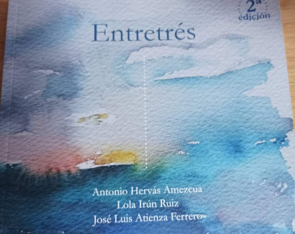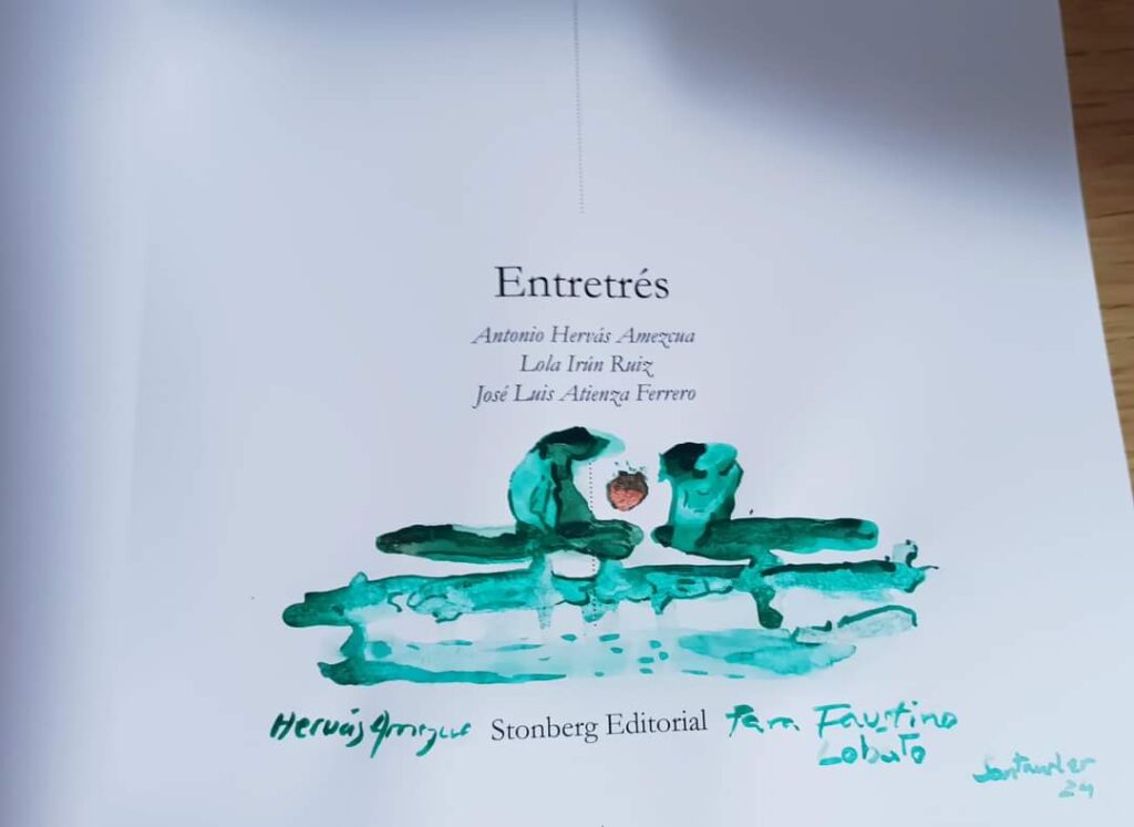 La tarde anterior a esta intervención cenamos con Julio, Manuel Ronces, su marido, y el pintor Antonio Hervás. Un encuentro distendido en la playa de Tagle, cerca de Las Anjanas. Antonio me dedicó el libro ENTRETRÉS que ha publicado junto con los escritores, Lola Irún y José Luis Atienza.