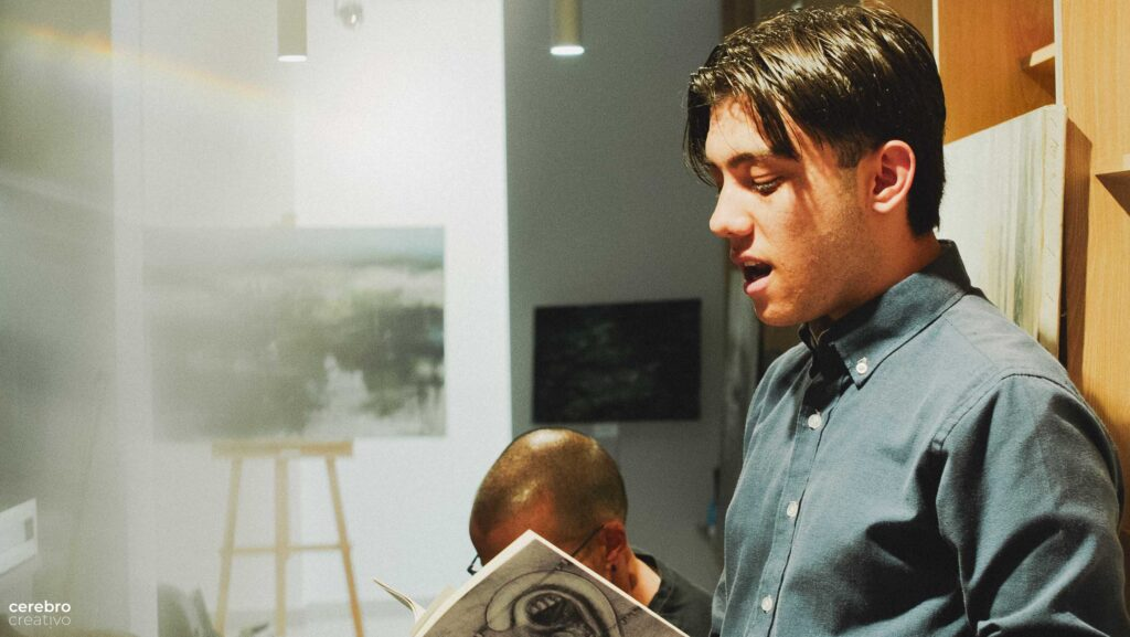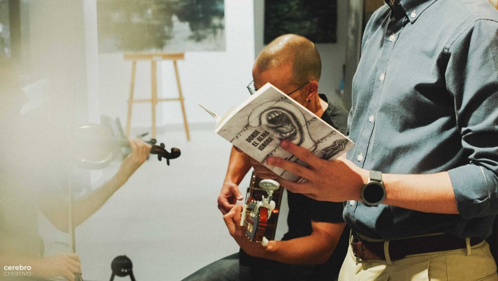 Antes de la intervención de Javier, Hugo, un alumno suyo recitó un poema. Magnifico. Mientras recitaba Octavio, con su violín y Lauren, con su guitarra, mantenían el ambiente.
